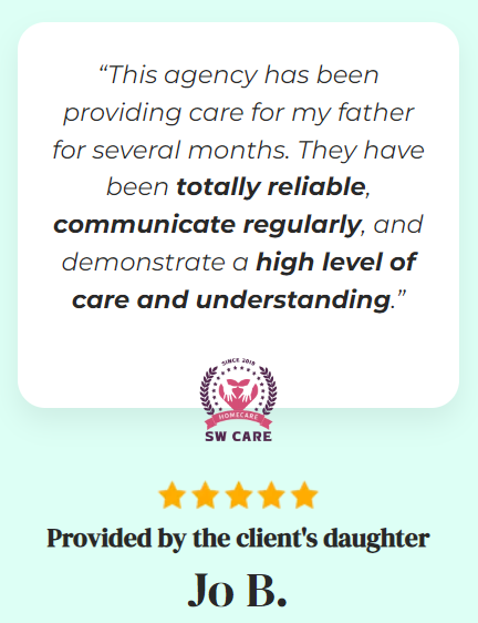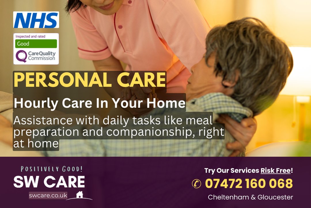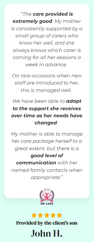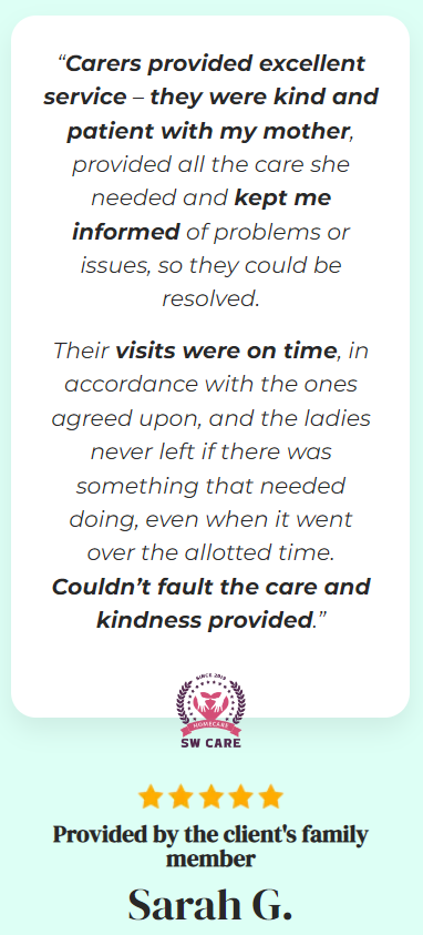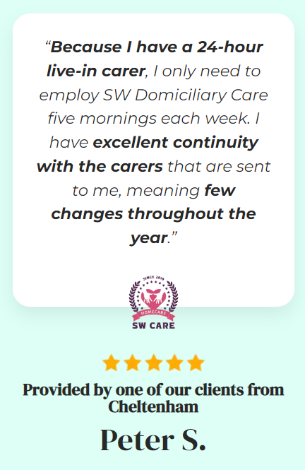 Cheltenham homecare you can trust — personalised support when you’re unsure who to rely on. SW Domiciliary Care Ltd has supported local families since 2018. Rated 9.9/10 and part of an award-winning group, we specialise in private, self-funded care. Our strength is personalisation: every plan tailored, every carer trained to give time, attention and respect. From daily help to companionship, we deliver dignity and comfort at home. Talk to our Cheltenham team for clear, no-obligation guidance.